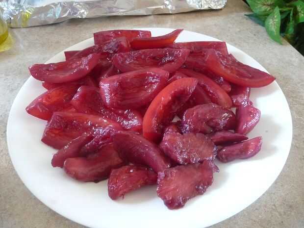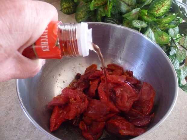 Después los tomates están bien asados, ponerlos en un bol y añadir aproximadamente 1/3 de taza de vinagre de vino. Revolver bien el tomate y el vinagre. Deje que ellos durante unos minutos, luego mezcle otra vez. Escurrir los tomates en un colador. (Guardar el vinagre para aderezo de ensalada!)