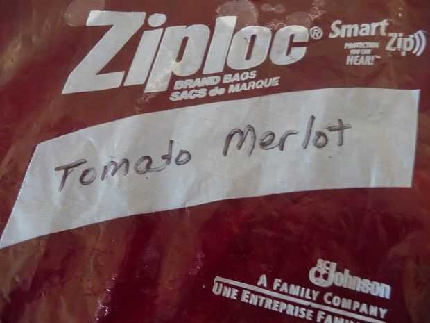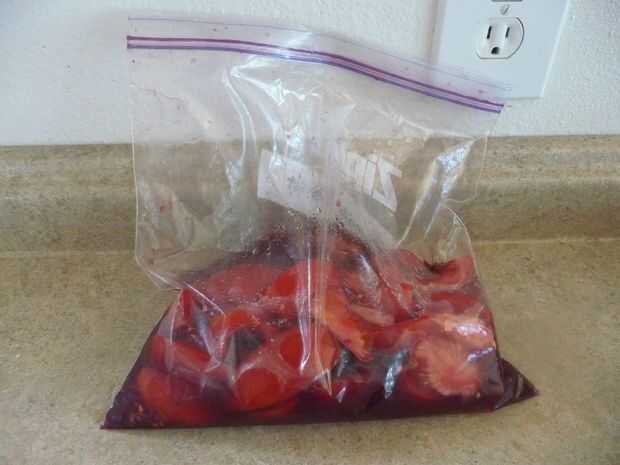 Después de marinar, retire los tomates en un colador a escurrir. Guarde la marinada de vino reservada, etiqueta de la bolsa de ziplock y congelar inmediatamente por lo que es seguro para uso futuro en la cocina u otra tanda de tomates.