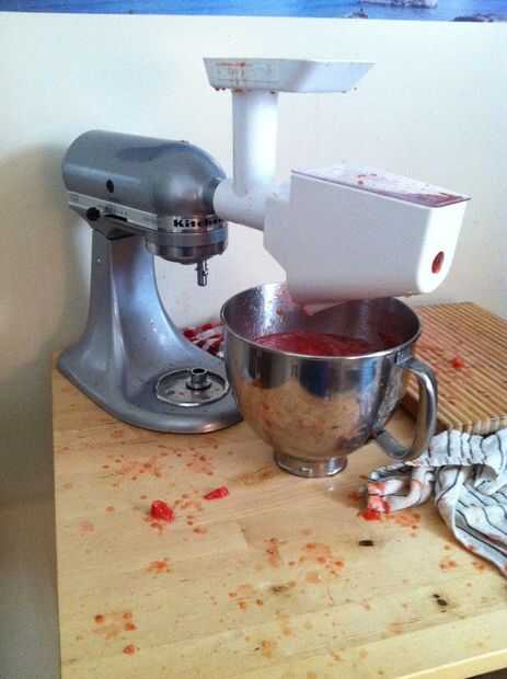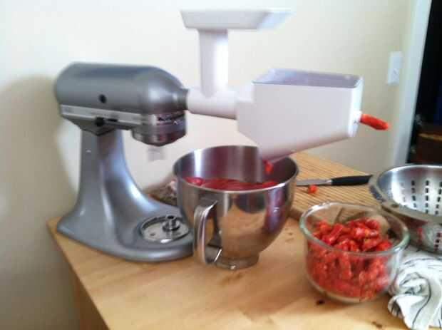 Yo soy un gran fan de mi batidora Kitchenaid y este accesorio realmente optimiza el proceso de elaboración de la salsa. He hecho esto antes de donde he aplastado los tomates con la mano sobre el bote. Es divertido. La olla empieza a burbujear, salpicaduras pueden disparar por lo que prefiero un poco este método. Como un bono adicional, este accesorio separa las partes gruesas y delgadas de tomate. Esto solía para hacer salsa/salsa de tomate fino y grueso y es mejor. Trabajos finos mejor en pasta, gruesa es ideal para pizza. Me gusta.