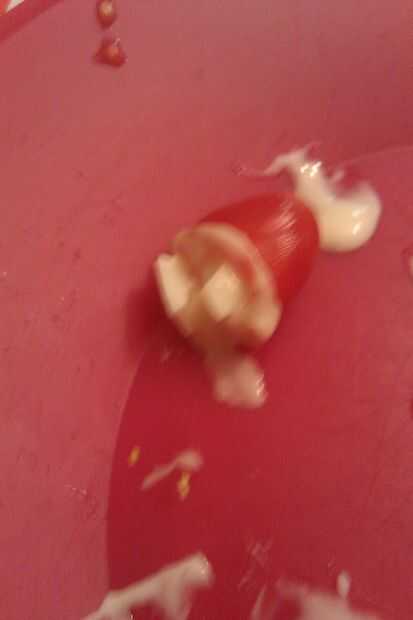 Ingredientes:Huevos durosTomate SaladetMayonesaPasos:1. Corte la parte inferior y la parte superior de los huevos planos para ayudarlos a sentarse recto (vea el vídeo)2. Corte la parte superior de los tomates de Roma como se muestra en el video3. hac