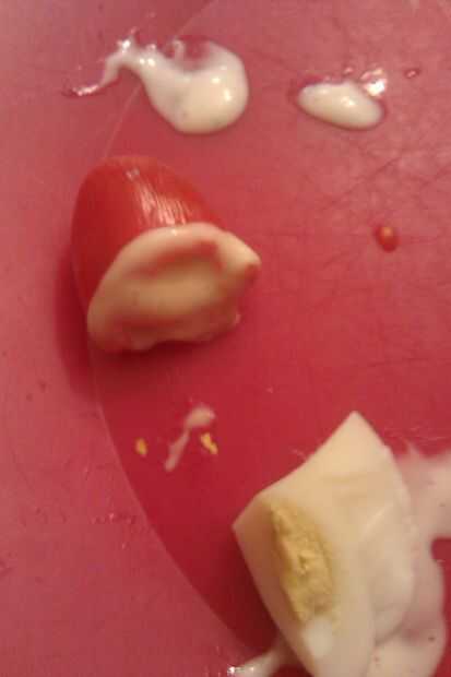 Ingredientes:Huevos durosTomate SaladetMayonesaPasos:1. Corte la parte inferior y la parte superior de los huevos planos para ayudarlos a sentarse recto (vea el vídeo)2. Corte la parte superior de los tomates de Roma como se muestra en el video3. hac