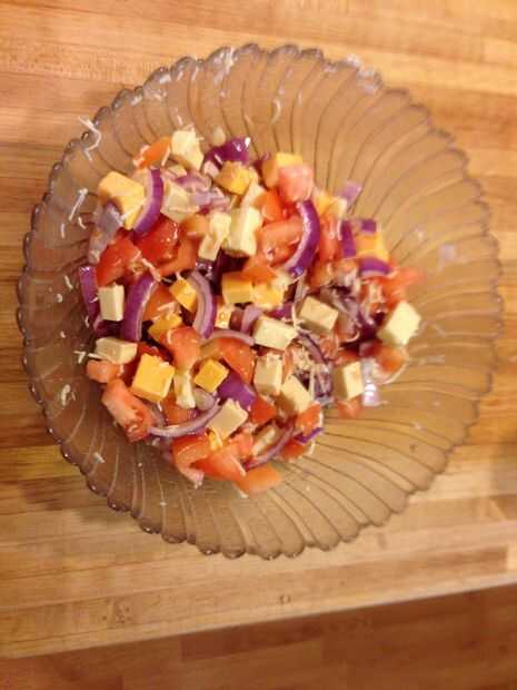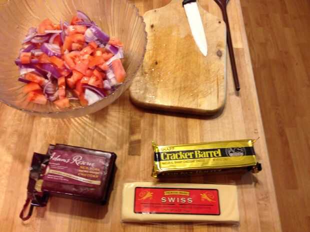 Si lo desea, puede sustituir cebolla amarilla o blanca. Incluso una chalota pequeña es buena especialmente cuando se utilizan cebollas amarillas. También funciona bien con Sharp blanco o queso Cheddar amarillo. Lo mismo ocurre con el tomate. Cualquier variedad a trabajar. Escoge los que más te guste.
