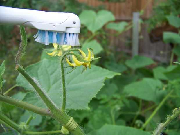 Para polinizar la flor, encienda el cepillo de dientes y suavemente y brevemente toque al tallo de la flor, o racimo de flores o pétalos. No toque a la cara de la flor. Que es todo lo que se requiere, simplemente mantener el cepillo de dientes con tus herramientas de jardín y pasar unos segundos cada vez que visite el jardín, los resultados valen la pena.