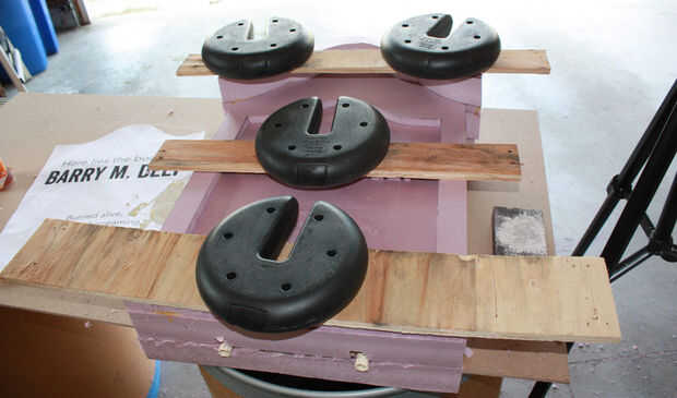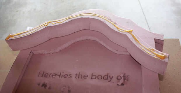 Con 2x4s o tablas de madera o algo plano, pone en la lápida y añadirles cosas pesadas. Esto evitará todo juntos como se seca. Tomar una cerveza y deje que se seque. Pegamento del gorila será seco en unas 4 horas y espuma tablero pegamento necesita 24 horas.