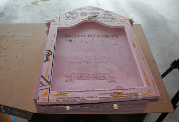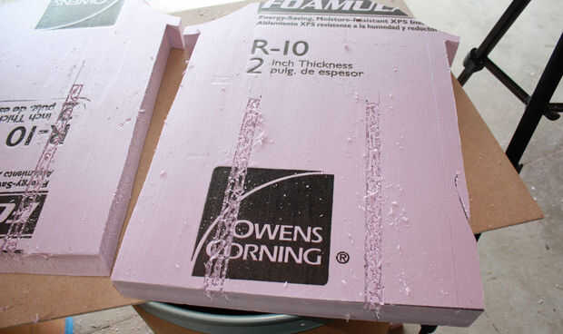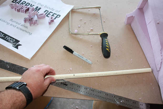 Realmente me quedo sin pegamento de Junta de espuma cuando me estaba haciendo esto. Y no me sentía como correr, usé el pegamento gorila para todo esto. Luego necesitas hacer los cortes para las tuberías en que serán el soporte para la piedra sepulcral en su jardín. Me mide en cerca de 4 pulgadas de cada lado y 12 pulgadas para arriba. Utilizando la Dremel y una broca de corte, es necesario retirar el material de que está ahí para hacer el canal para los tubos. Hice mi cortes demasiado profundos, así que asegúrese de que su profundidad en su Dremel está llamada a ser la mitad del ancho de la tubería. Pero el pegamento gorila se expande mucho así que ayudó a llenar en el espacio.