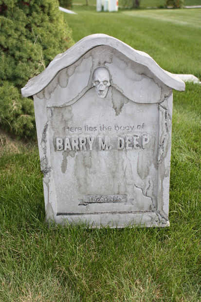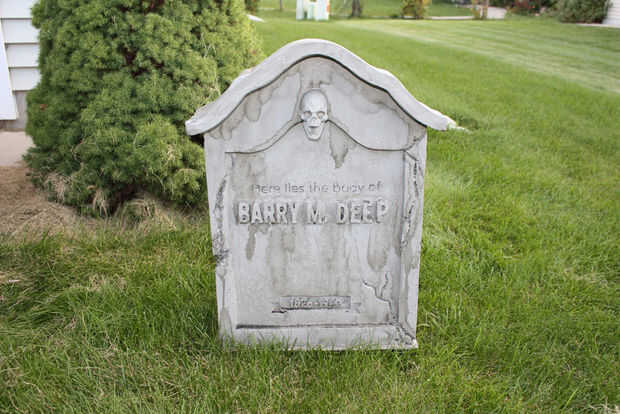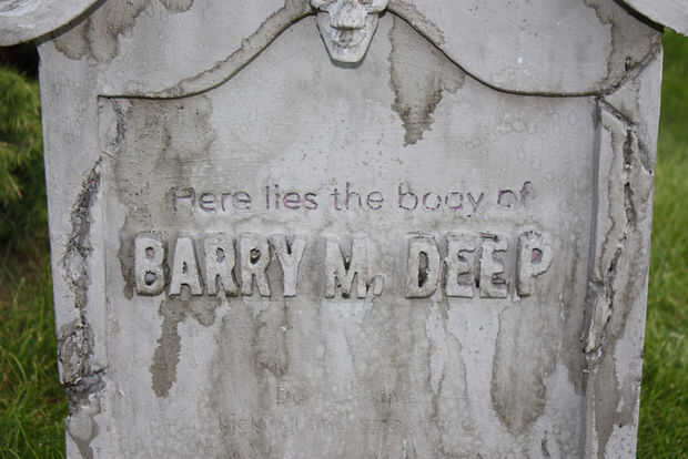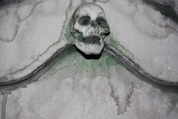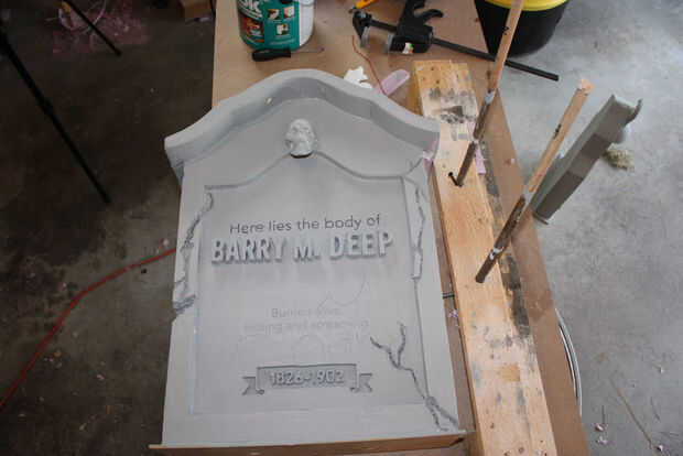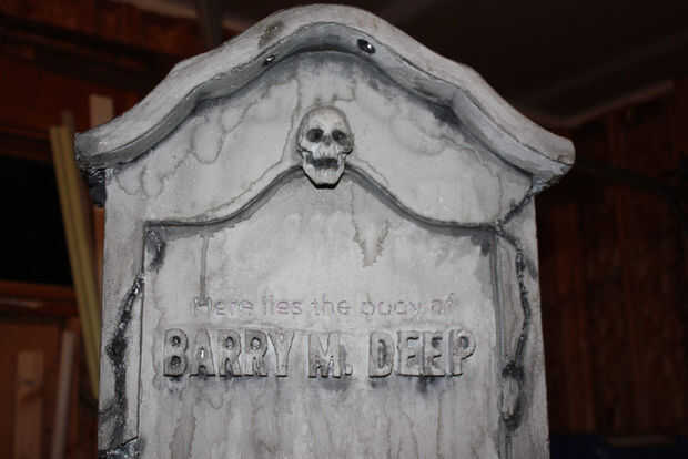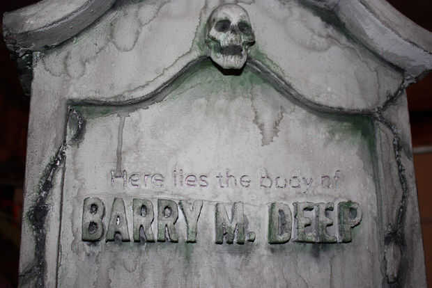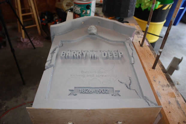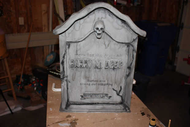 A continuación va a utilizar más negro, pero un poco diluido para entrar en los recovecos profundos de las grietas y entre las letras. Esto no es tan descafeinada como la erosión anterior. Se trata de pintura casi toda su fuerza. En muchos lugares, quisiera pintar en negro y luego moje el cepillo y apenas manchar alrededor. Eso lo hizo sentir mucho más orgánico. También se da el drama y el contraste que cabría esperar en una lápida espeluznante. No te olvides de mover alrededor de su tumba y para voltear alrededor un poco para asegurarse de que llegar a todos los ángulos.