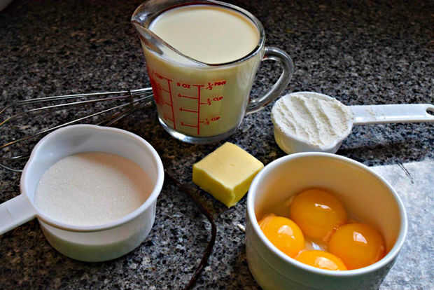 Empezamos con los ingredientes para la crema pastelera: 4 yemas de huevo, azúcar de 1/2 C, C de 1 1/2 leche, almidón de maíz de 1/4 C, 1 vaina de vainilla y 2 cucharadas de mantequilla sin sal.