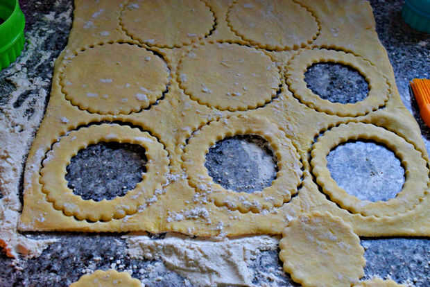 Tomar una pieza descongelada de masa de hojaldre (una hoja de un paquete estándar de masa congelada). Corte 8:10 centímetro círculos con un cortador de galletas. Tomar un pequeño cortador de galletas y cortar el interior de cuatro de los ocho círculos, para formar cuatro anillos.