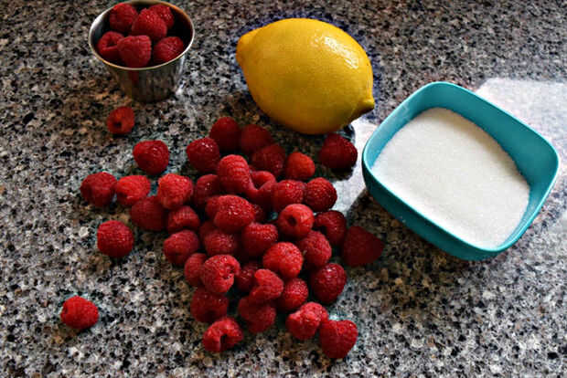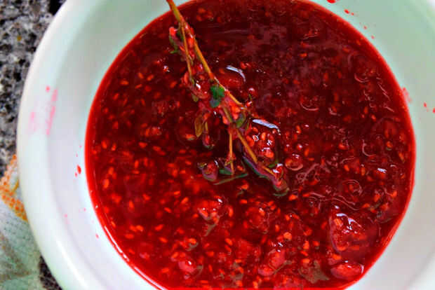 Mientras hornea los Vol au Vents, hacer el coulis. Un coulis es simplemente un puré de la fruta que se utiliza como salsa. Para hacerlo, calentar una pinta de frambuesas frescas (reserva cuatro bayas para guarnición) en una cacerola pequeña. Añadir 1/3 taza de azúcar, la ralladura de un limón y el jugo de la mitad de un limón. Utiliza un tenedor para romper los granos. Añadir una ramita de tomillo, dejando todo. Retirar la salsa del fuego y deje que el tomillo infundir como se refresca. Luego retire el tomillo y deseche. Coloque la salsa en el refrigerador hasta que lo necesite.