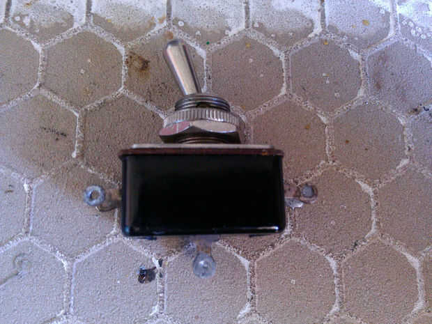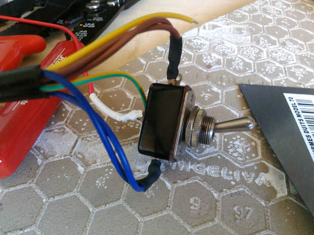 Había soldado los dos cables marrones de las luces (plenos poderes) a la patilla izquierda del interruptor y los dos cables azules de las luces (menos energía) al pin derecho del interruptor.