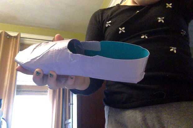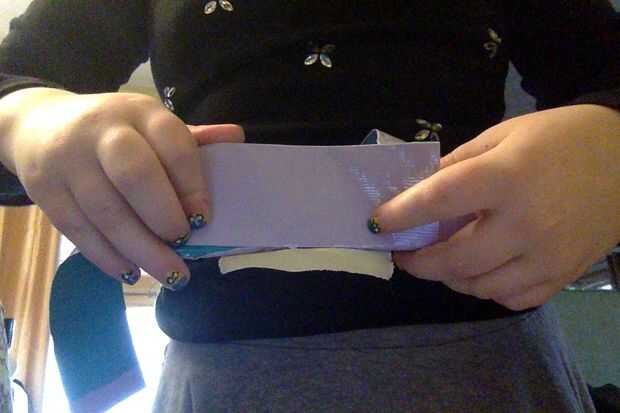 Tomar una tira de cerca de 8 pulgadas y poner otro de un color diferente en la parte posterior. Luego debe tomar un pedazo de cinta alrededor de una pulgada largo palillo en el borde inferior como se muestra en la figura 3 y luego pegarlo al borde de la franja de 8 pulgadas que hicimos anteriormente. Siga este paso hasta que haya hecho el talón de la Tom. Repita este proceso para hacer el otro. Es opcional añadir un toque como yo lo hice por ejemplo rayas en los dedos del pie.
