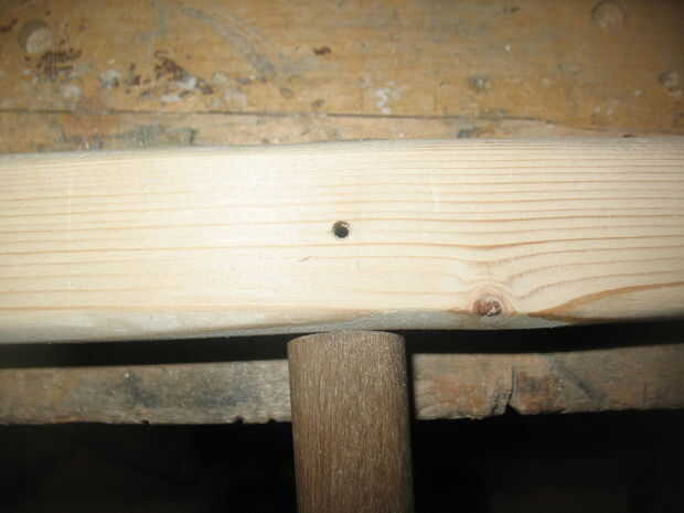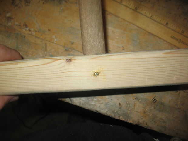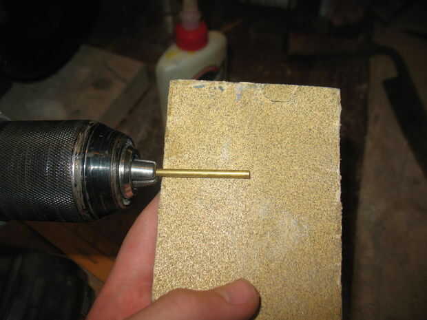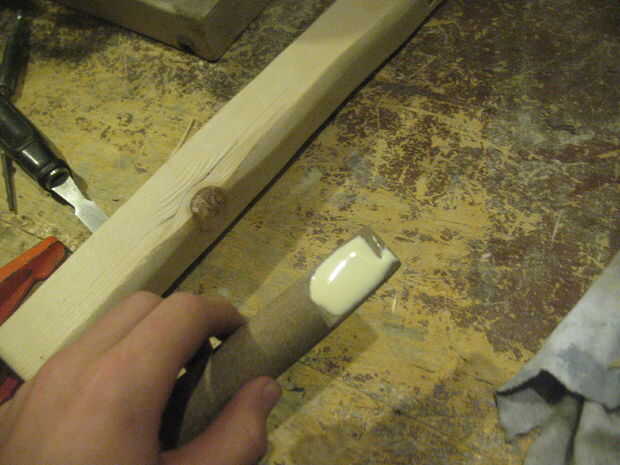 Para la fuerza agregada, perfore un pequeño agujero a través de la hoja y el mango. Corte el perno de cobre amarillo a más de 1 1/2 '' de largo. Meter en el taladro y áspero para arriba con un papel de lija de 100 grano. Epoxi en el agujero. El perno debe ser ligeramente más grande que el agujero y necesita suave golpecitos con el martillo para dejarlo en. Una vez seco el epoxy, pulir el pasador para que quede a ras con la superficie de la madera. ¡ ADVERTENCIA! EPOXY ES ALTAMENTE TÓXICO. USELO BAJO SU PROPIO RIESGO.