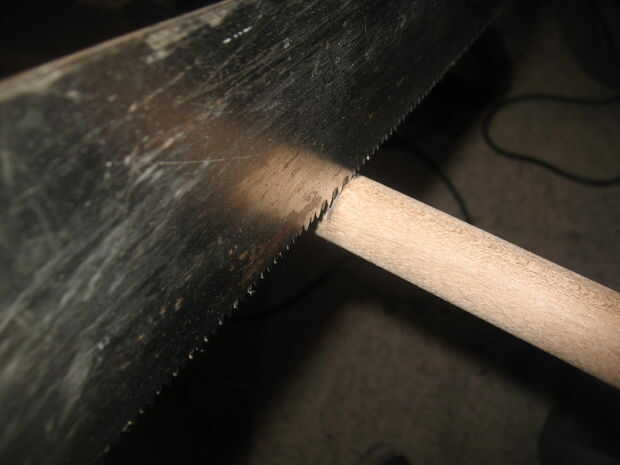 Hora de sacar ese pasador! He utilizado un taco de 1" porque cabe mi mano bastante bien. La longitud debe ser 2 1/4 '' más de la anchura de su mano. Por ejemplo, mi mano es 3'' de ancho, por lo que debe ser el taco 5 1/4 '' de largo. Use la Sierra de mano para cortar la espiga en la marca a tu medida. Una vez que se corta la espiga, medir 1 1/2 '' del final y hacer una marca que recorre todo el camino. Ahora viene la parte difícil. En el fondo, dibuja 2 líneas aproximadamente 1/2 '' de apart. Luego siguen las líneas hasta la marca que hiciste anteriormente. Asegúrese de que siguen siendo separados en la marca de 1/2 ''. Mira las fotos.