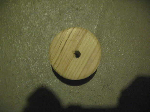 Antes de comenzar este paso, encontrar algo redondo que usted puede conseguir el dedo pulgar y dedo índice alrededor para que las puntas toquen. Consigue tu 5/8 '' madera y trace su ronda algo sobre él. Usar la sierra caladora para cortar, otra vez en el ajuste suave. Esto no es la forma más eficiente de hacer esto, pero funciona. Tomar la lijadora eléctrica y suave el disco hacia abajo. Una vez hecho esto, perfore un agujero a través del centro.