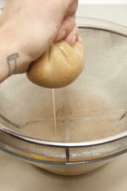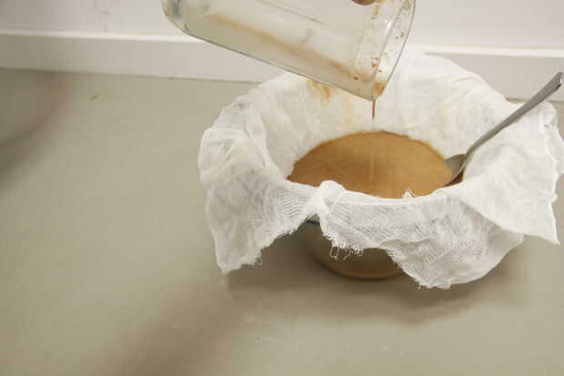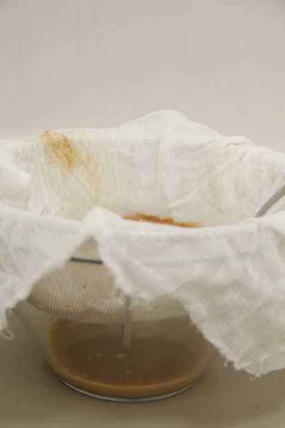 2. Utilice la estopilla para colar la materia sólida de la almíbar de su planta de tónico de jengibre