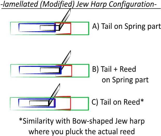 En el caso C, en la fotografía, la cola se coloca sobre la parte de reed actúa del mismo modo como la parte de puntear en un arpa del judío en forma de arco.