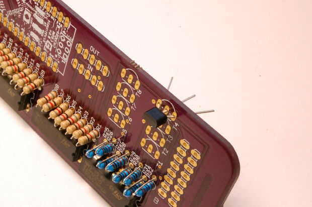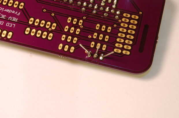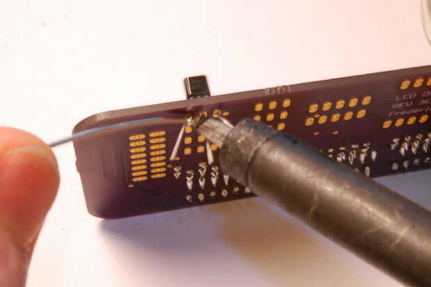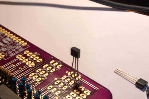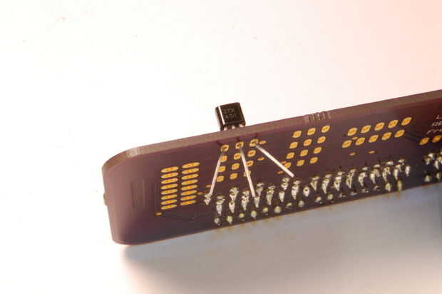 - La soldadura de cada pata del transistor en el lugar, dejando el transistor se enfríe cada vez. Esto es porque los transistores son más susceptibles a daño térmico. (Imágenes 6 y 7)