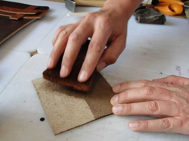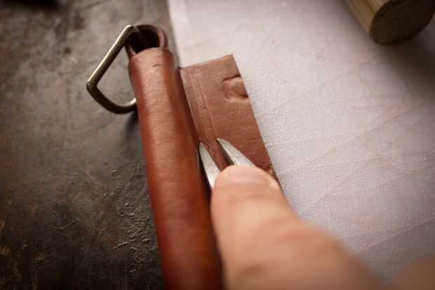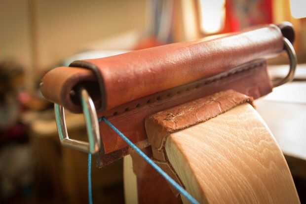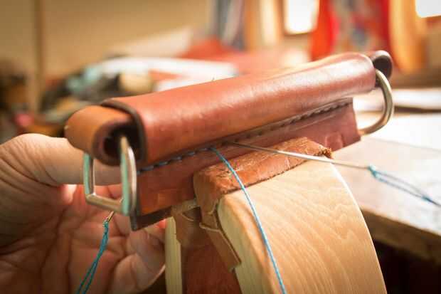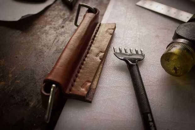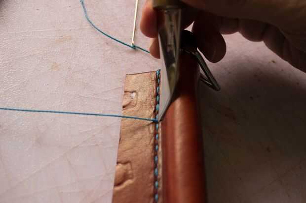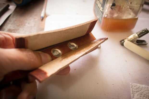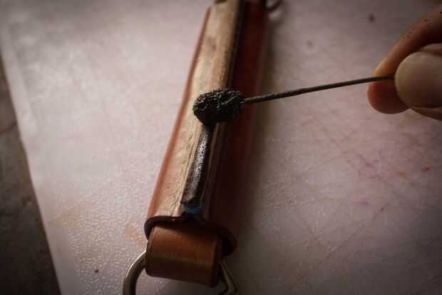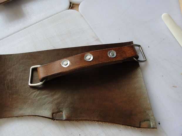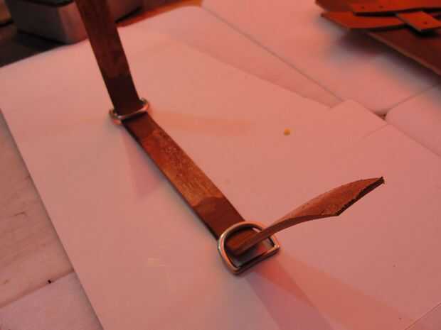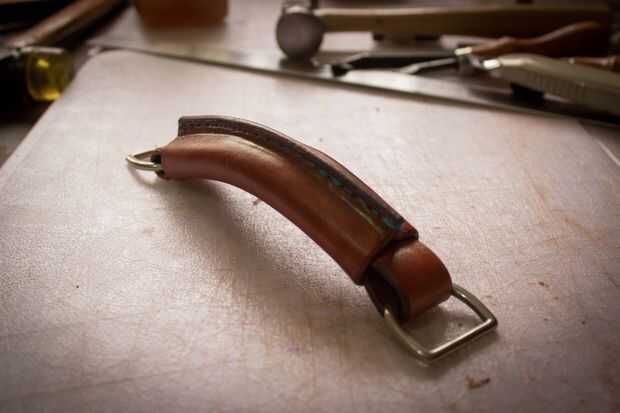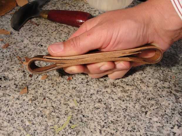 El mango está hecho de dos piezas de cuero. Uno mide 1 "x 16 1/2". Lo otros 4 3/4 "x 4 3/4". La tira será dos pliegues en él donde se encuentran los dees. Cemento y remache juntos después del pulido de los bordes donde están los dees. Moje el otro trozo de cuero y forma alrededor de la manija. Lo deje reposar durante la noche para secar. Juntas de cemento, puntada, borde del corte y acabado borde. Me gusta darle a la palanca una curva agradable. Si su piel es dura puede mojar todo otra vez para hacer esto.