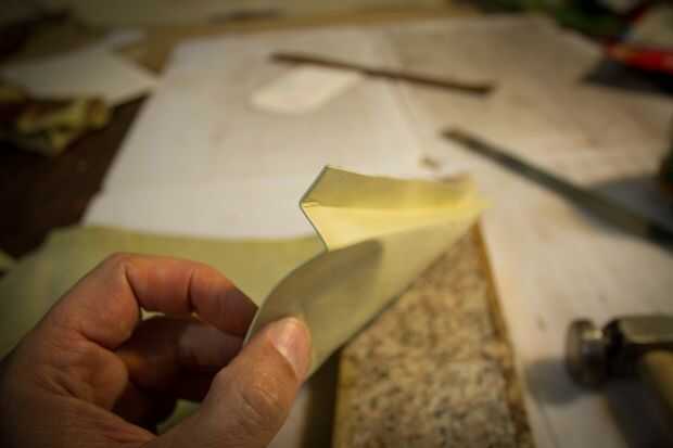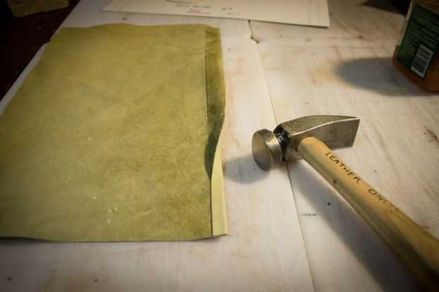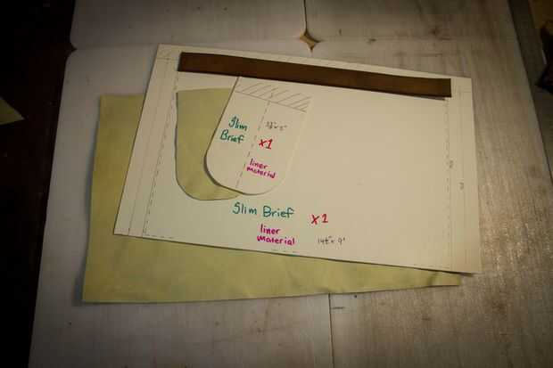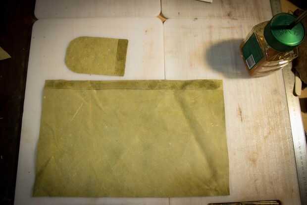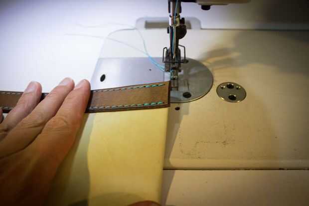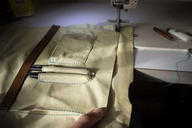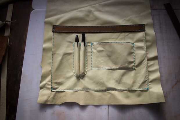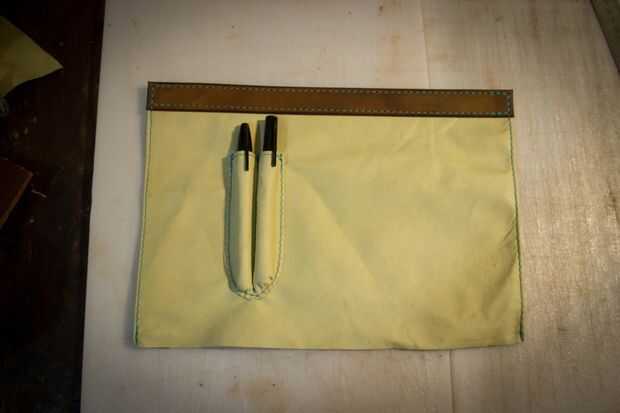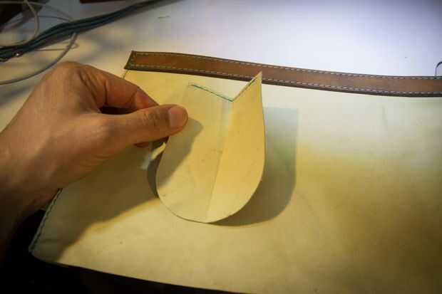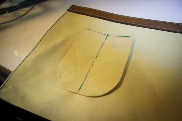 Yo use un cuero fino para mis bolsas. Es un cuero suave que se utiliza para forrar zapatos de vestir bien. El bolsillo tiene un lado acordeón para que sea más espacioso para los documentos. También agrego un soporte y un pequeño bolsillo para un teléfono. Necesita coser el bolsillo y adjuntarlo a la pieza de cuero de la guarnición antes de que cemento el trazador de líneas en.