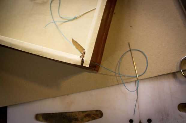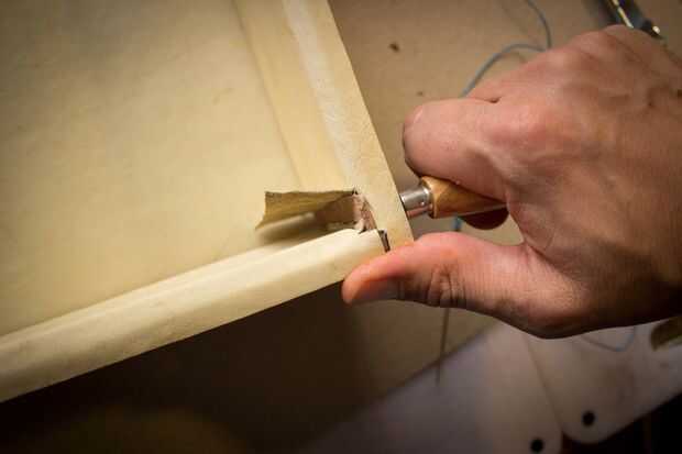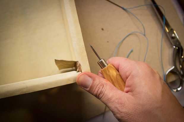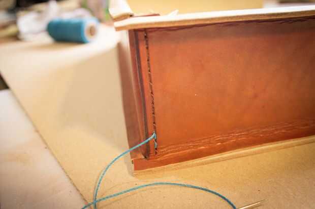 Use una lezna de costura para terminar los agujeros a través de la pieza de fondo de cuero y coser.