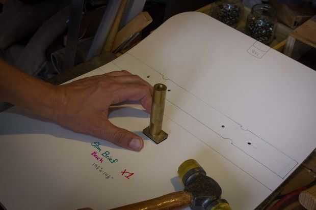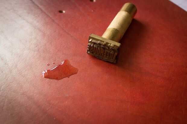 Tuve mi logotipo en un sello de cobre amarillo que tiene dos maneras de usarlo. Puede utilizarse como se muestra con un asa de latón para acabar con ella en mojar el cuero curtido vegetal. También puede ser atornillado en un hierro eléctrico similar a un soldador. Funciona bien en cuero cromo como que no mantenga mojado estampado marca así.