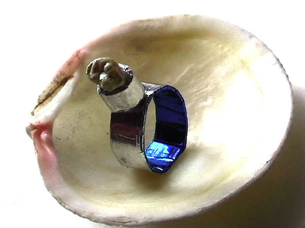 Me inspiré en Melbourne artista Polly Van Der Glas. Primera vez que vi sus anillos de dientes me hicieron reír. Para mí, la idea de utilizar los dientes en un anillo trae la pregunta ¿por qué valoramos las rocas brillantes como piedras preciosas? Creo que se reduce a la habilidad o el artista.