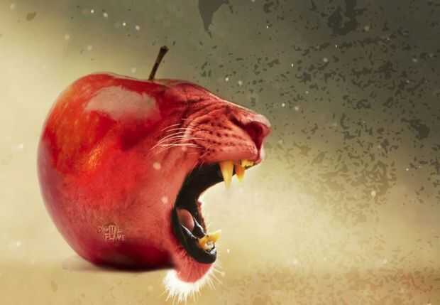 Un principiantes ejercicio de Photoshop es para cortar una boca de lobos con la herramienta lazo poligonal y luego a super imponen junto con una manzana.