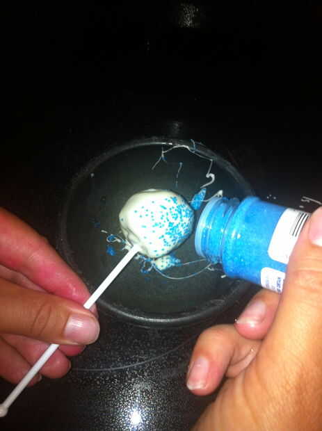 Cada cake pop en la corteza de la inmersión y deje el goteo de exceso. Déjelo enfriar durante 1-2 minutos para que la corteza esté suave pero no gotea.