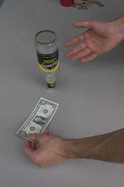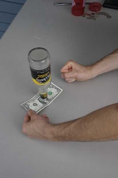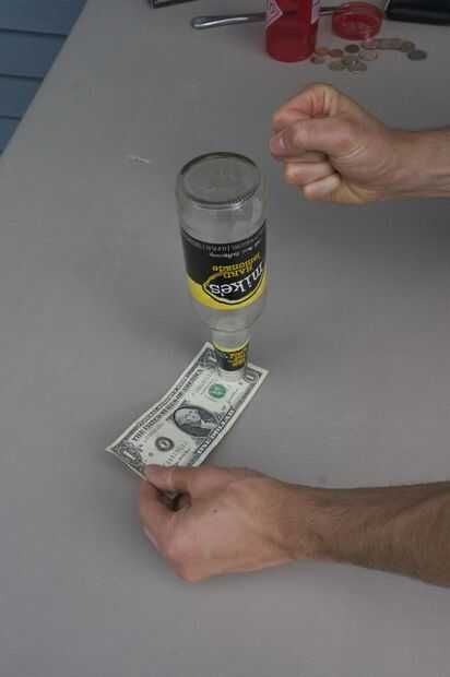 Para la misma apuesta hay otra opción. En lugar de rodar el proyecto de ley también puede hacer un puño y golpear la mesa mientras tira suavemente del dólar. Como la botella rebota, el proyecto trabajará su camino hacia fuera de debajo. Esto funciona bien siempre y cuando la mesa permite suficiente rebote. Si es demasiado fuerte la botella apenas se movió.