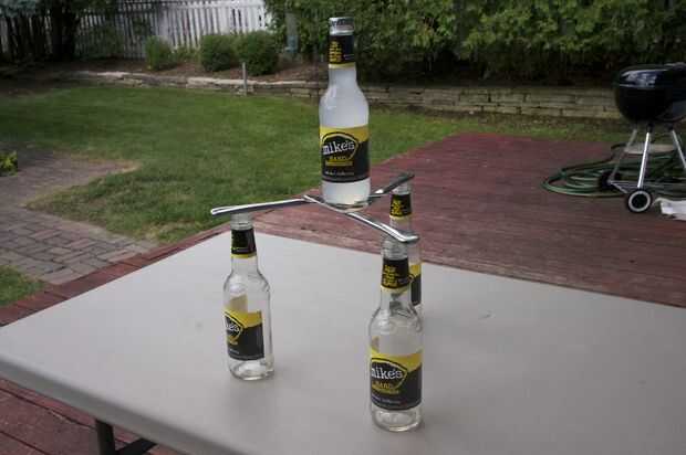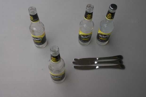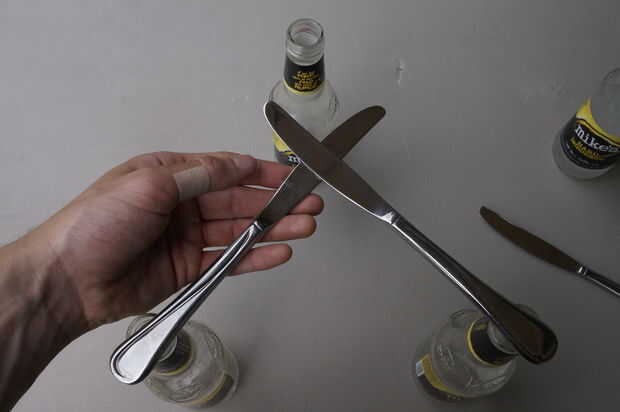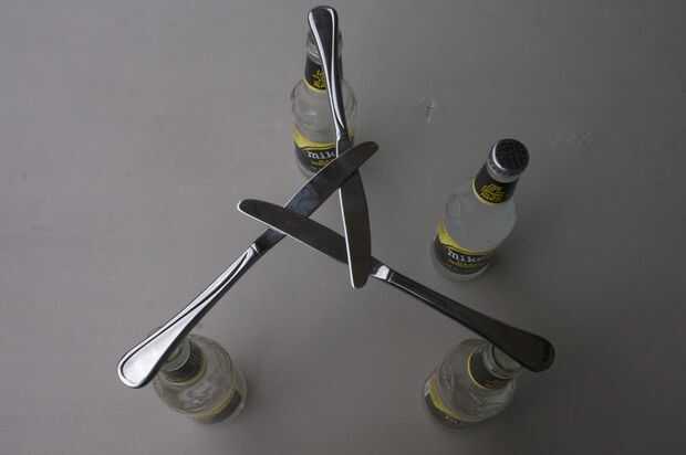 ¿Puede equilibrar una copa completa en la parte superior tres vacíos y algunos cuchillos de mantequilla? Por supuesto usted puede! Coloque las botellas en forma de triángulo. Sostener dos cuchillos que cruzan en las cuchillas y sus botas cada resto en una botella separada. Añadir la tercera cuchilla que teje debajo de uno de los dos ya está en marcha y sobre el otro. Enhorabuena, eres un maestro de la arquitectura! Bueno, tal vez no, pero sigue siendo genial.