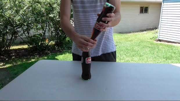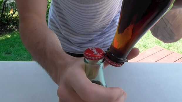Mantenga una de las botellas boca abajo en un ángulo ligero. Apriete el botón de los casquillos juntos y luego los pellizque entre el dedo Palma y fore. Apriete su mano en un puño y lentamente aumentar el ángulo de la botella superior. En segundos aparecerá la parte superior de la botella de fondo y estarás listo para disfrutar de tu refresco.