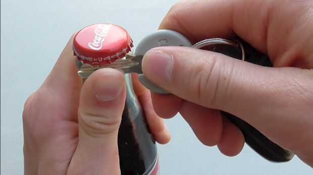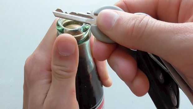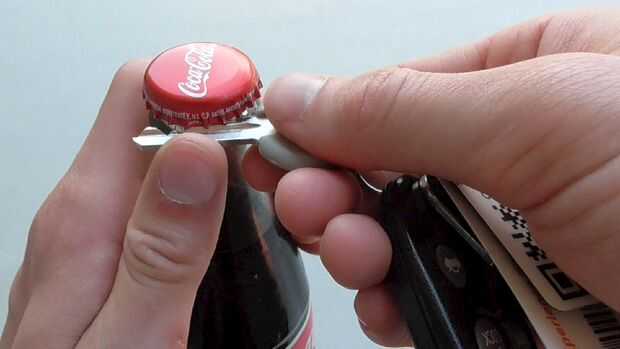 El sujetador de la llave entre el pulgar y la botella con los "dientes" de la llave justo debajo de la tapa. Girar la llave para que los "dientes" doblado en ángulo hacia arriba, el borde de la tapa hacia afuera. Ahora solo se aplica presión con el pulgar hacia arriba y la tapa debe de pop.
