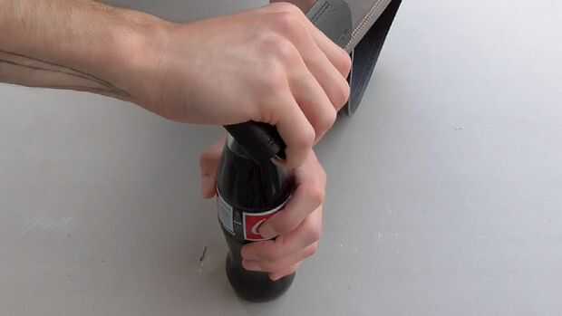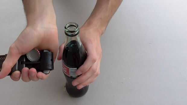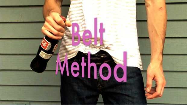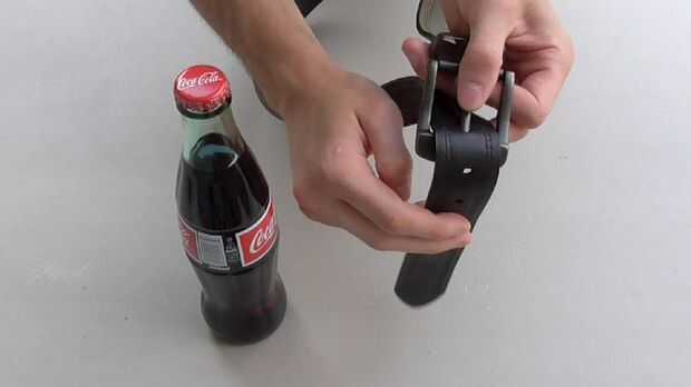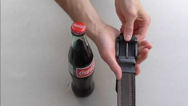 Quitarse el cinturón y vuelva a fijarlo. Meter la lengua detrás de la hebilla y luego colocar piso en la palma de su mano. Enganche la barra que encaja en los agujeros de tamaño bajo el labio de la tapa de la botella y con un rápido movimiento de la muñeca pop justo al lado.