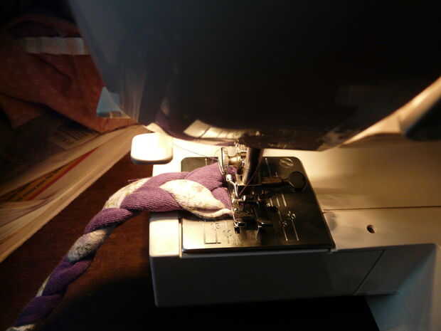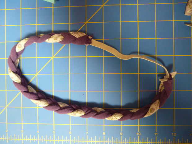 Medir todo el camino alrededor de su cabeza, justo detrás de las orejas. Mi medida es 22 pulgadas. Ahora Mida la trenza y corte a 5 pulgadas más corta que la medición principal (17 pulgadas, para mí.) Coser el otro extremo de la trenza para evitar que deshaciendo. Corte un pedazo largo de 5 pulgadas de elástico. Superposición de un extremo de la trenza y un extremo del elástico por alrededor de una media pulgada y coser sobre ellos un par de veces para hacer una costura resistente. Repita con el otro extremo de la trenza y luego el otro extremo del elástico, para hacer un círculo. Asegúrese de que la trenza y elástico no retorcidas, antes de coser!