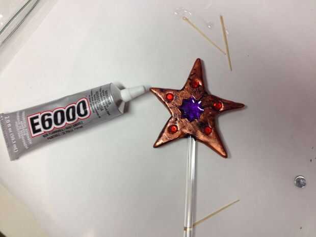 Utilicé un palillo de dientes para frote una pequeña cantidad de E6000 pegamento (que se encuentra en las tiendas de artesanía y hobby) a la estrella en las impresiones hechas y coloca cuidadosamente la piedra de la gema en el pegamento. Si aplicar gemas a ambos lados, dejar que el pegamento situado en un lado antes de hacer el otro.