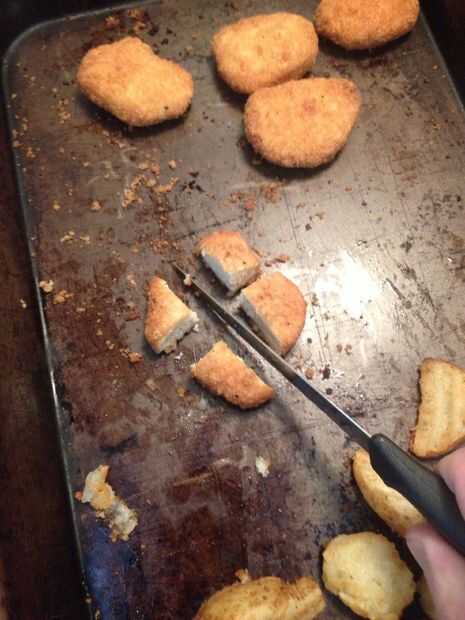 Use un cuchillo para el cuarto de los nuggets. O, alternativamente, rómpalos como grande o pequeño como quieras.