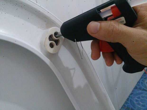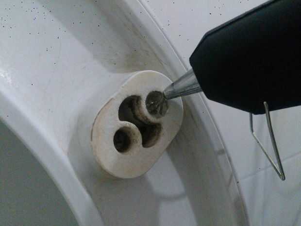 Ahora desconecte su arma por lo que no está todo más caliente. Si está demasiado caliente el pegamento mantener derretirse. Después de que usted desenchufe su arma, comenzar a añadir la parte media superior de pegamento el agujero. Agregar hasta 2 mm o 3 mm del agujero. Con el asiento hacia arriba, el pegamento se derrita aún hacia abajo un poco, por eso ponemos la mitad superior más que la parte inferior del agujero.