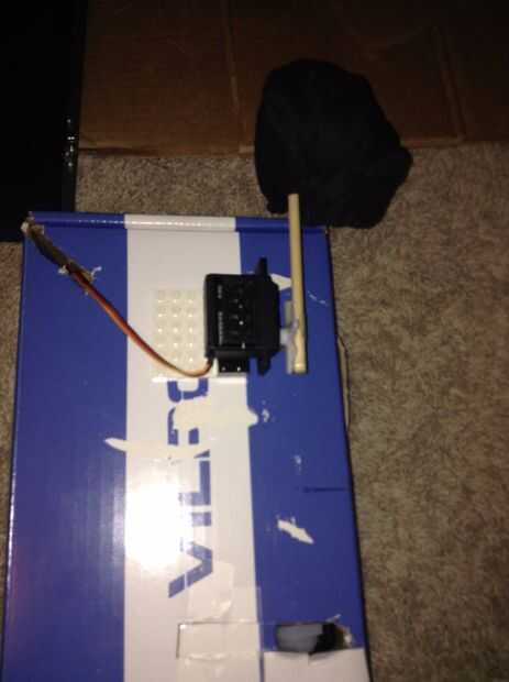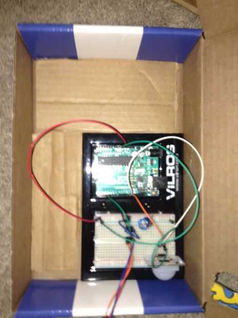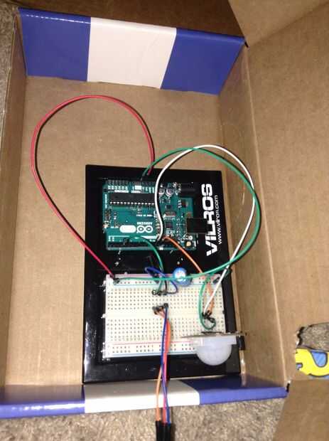 utilicé la caja que el arduino kit vino pulg. cortar una hendidura en la parte superior para encajar el cable de servos y uno cerca de la parte inferior para el servo del pir ver a través. el sensor pir es muy sensible así que tardará un poco de tiempo para hacer el agujero del tamaño correcto.