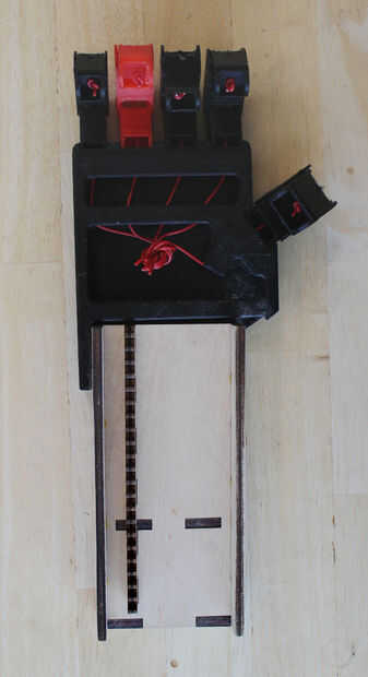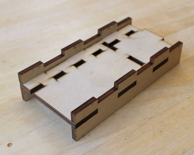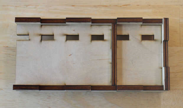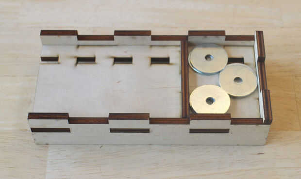 Como la base, la diapositiva no requiere pegamento a permanecer juntos. Comience agregando los lados para el panel inferior, comprobando que estén en la orientación correcta. Luego agregar las paradas e inserte pesos. Empuje la parte superior (con la mano unida). Necesitará pegamento la parte superior hasta tenga garantizar. Finalmente, empuje el estante en su lugar.