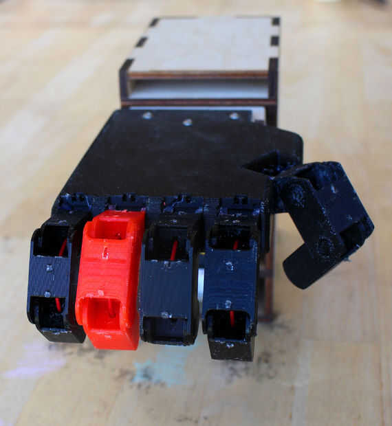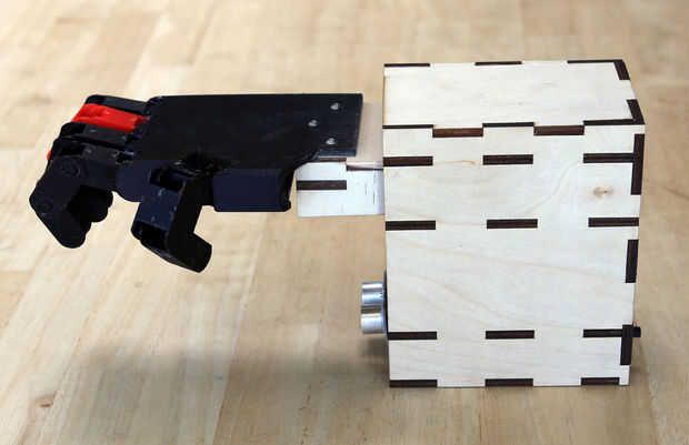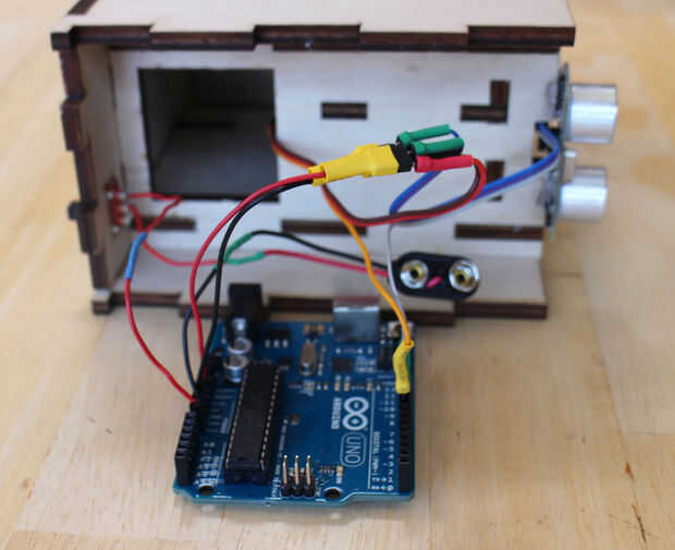 Todos los cables están hechos, simplemente conecte todo juntos y a Arduino. Los cables Vcc de la sensor y servo que tanto enchufe el divisor de potencia hecho previamente, que se conecta a la clavija de 5V de Arduino. Semejantemente, conecte los cables de tierra de sensores y servos a un pin del Arduino GND. El pin de señal para el servo va al pin digital 8, y el pin de señal para el sensor va al pin digital 7. Finalmente, el plomo restante desde el interruptor de encendido se enciende a Vin (Arduino) y el cable de tierra de la batería va a GND.