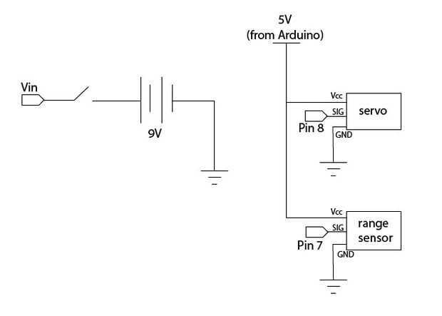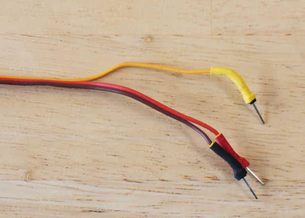 Para conectar la electrónica, se necesitan unos cables. En primer lugar, hacer un par de "separadores" para alimentación (5 v) y toma de tierra para el sensor y el servo de Arduino usando conectores hembra. Ya que ambos dispositivos necesitan el mismo Vcc, los divisores de facilitan el cableado poner juntos y más compacto cuando está montado.