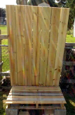 Llenar en el frontales tres aberturas entre los listones de arriba con los de la tercera plataforma. Utilice los tornillos de madera y sólo uno por cada extremo. Gire la paleta restante en su extremo y atornillar un listón en la parte superior e inferior para hacer una caja para sostener el aislamiento.