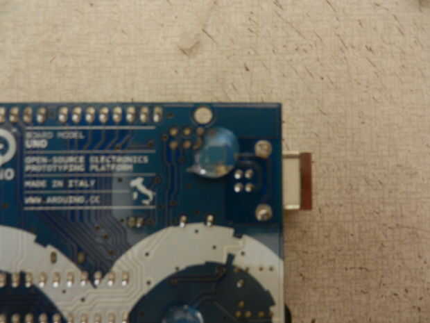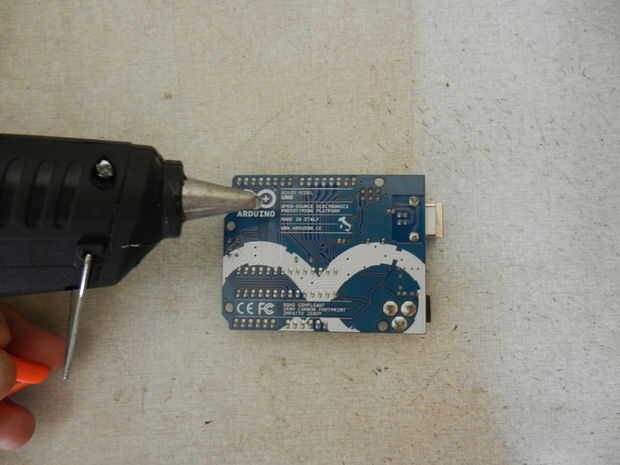 Ahora es el momento para hacer los topes para el arduino!! Para esto basta para prepararse la pistola encoladora y verter (aplica) el pegamento como los topes!! puede hacerlo donde quiera que desee en el arduino... preferentemente se hizo el likeIi de la esquina...