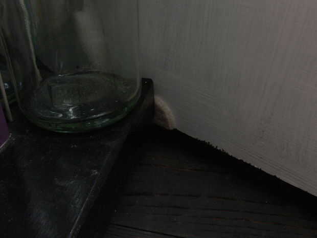 También, ya que quería que la puerta se abra lo más lejos posible, pero no chocar contra la esquina de mis estanterías, pegué un semicírculo de fieltro acolchado en la parte inferior de la puerta donde se golpea. Ahora puedo tirar la puerta abierta y se golpeó los estantes después de venir al detenerse el imán casi silenciosamente.