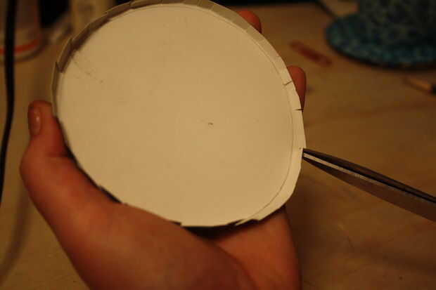 Trazar el círculo del tamaño que desea para la parte superior del sombrero. Recortarlo un poco más grandes, así que usted puede cortar fichas en él. Doblarlos para ocultarlos.