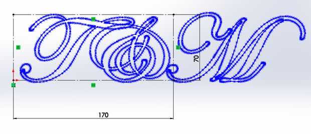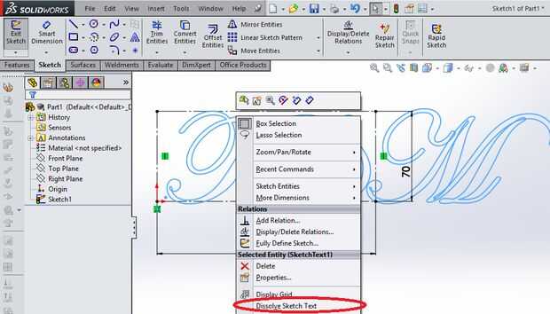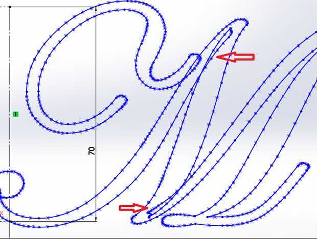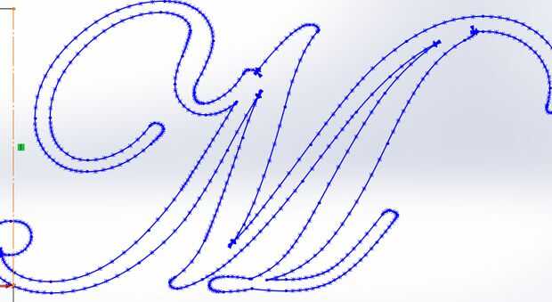 Mientras que en el bosquejo, haga clic en el texto y elija "Disolver boceto texto" (o botón derecho sobre el texto y el tipo "v") Esto creará un lío todo de tiras, con un cientos de puntos de la línea, pero esto es bueno, esto podemos editar. Cuando se acerca, puede ver rápidamente no será posible sacar este texto como es. Hay tiras superpuestas, y éstos tienen que recortarse antes de que podemos sacar.