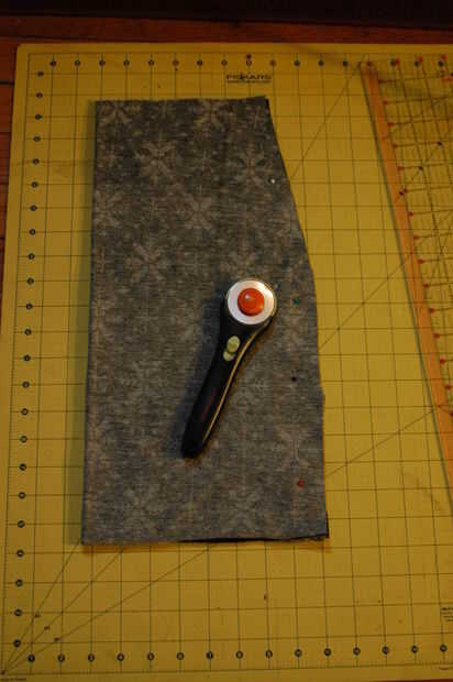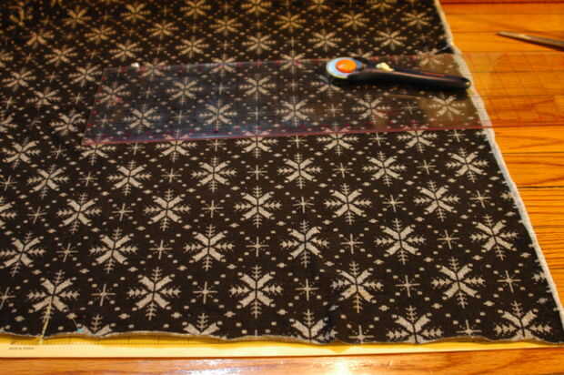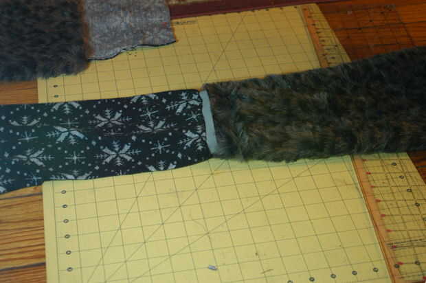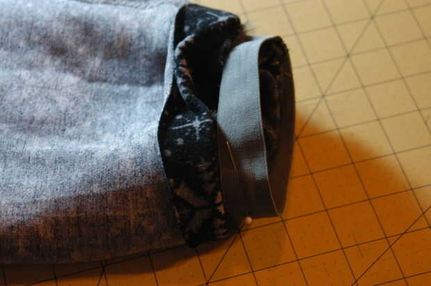 Haces lo mismo que haría con el cabezal de arranque normal, pero corta un adicional dos pedazos de material para el lado del forro/retroceso. Utilicé a una tela elástica con copos de nieve- y cosí las costuras de la parte inferior del material de copo de nieve bajo.