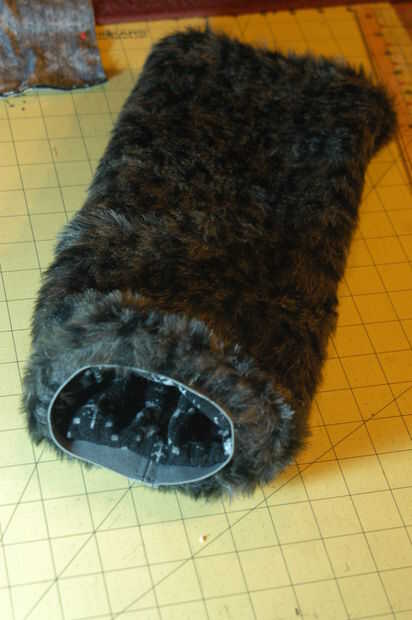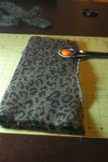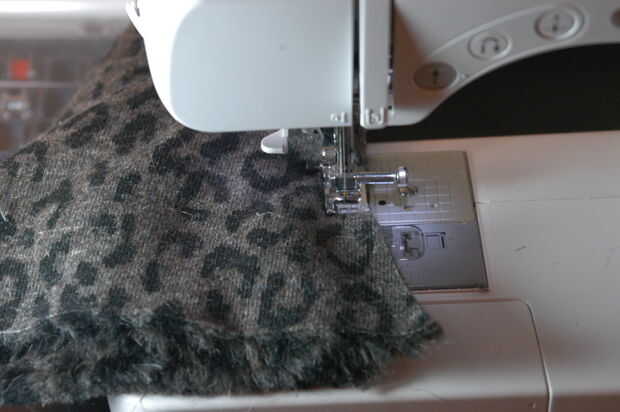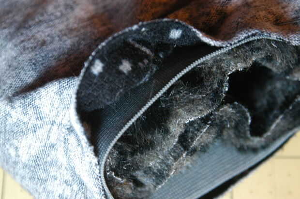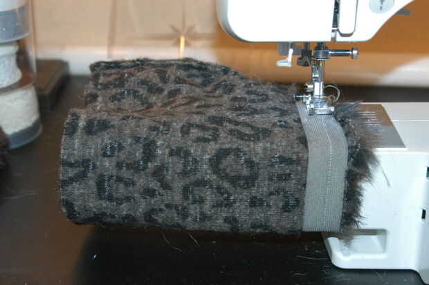 Tomar el elástico y colocarlo donde desee coser sobre el cabezal de arranque, alineando las costuras. Hay varias maneras de coser en. Puede plegar la piel del faux del elástico y luego mantenga tenso mientras les de coser juntos. Si usted desea hacer reversible calentador de la pierna como se ve en mi imagen, basta con tomar unos pasos. No hay necesidad para dobladillar la parte inferior de la piel como iba a arruinar su aspecto - por lo que se hace!