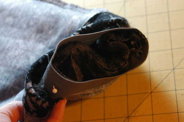 Después se cosen las costuras a los lados de la piel del faux y las costuras a los lados del material de copo de nieve, luego coloqué en este orden: la piel era lateral derecho, mientras que tomé el material elástico (usado para la parte de atrás) y hecho adentro hacia fuera. Luego, llevó el material de adentro hacia fuera y tiró de él sobre la piel y alineado las costuras y los bordes. Entonces tomé el círculo elástico y clavado en medio de la piel y material elástico (sólo en un punto porque era tan pequeño no había espacio para prender cualquier más lejos). Ver imagen para la explicación más clara. Entonces, me tiró de él tenso y cosido a través de las tres capas y dado vuelta adentro hacia fuera - y se ha hecho! Primeros de arranque reversible!