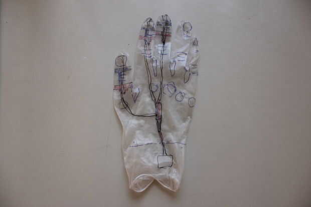 r. para que sea más fácil trabajar con las dos manos puede utilizar un guante de vinilo transparente como una ayuda. Apenas se deslice en el guante y dibujar donde todo debe ir en el guante. Ahora puede usar el guante para medir la longitud de los cables.
